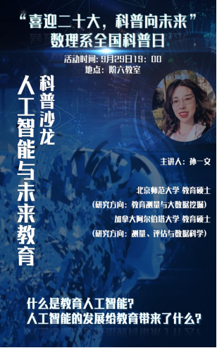 2022年9月下旬,全国各地纷纷启动了以“喜迎二十大,科普向未来”为主题的全国科普日系列活动。为弘扬科学精神,激发创新能力,普及科学知识,拓展学生视野,9月29日19时以“人工智能与未来教育”为主题的科普沙龙活动在第六阶梯教室成功举行。本次活动由taptap点点科学教育教研室青年教师、毕业于北京师范大学和加拿大阿尔伯塔大学的孙一文老师主讲。