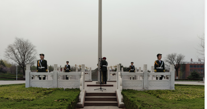 国旗护卫队的同学们迈着整齐的步伐,庄严走向升旗台。国歌奏响,激昂的《义勇军进行曲》前奏响起,升旗手振臂一挥,鲜艳的五星红旗迎风招展,在全系师生炽热目光的注视下冉冉升起。