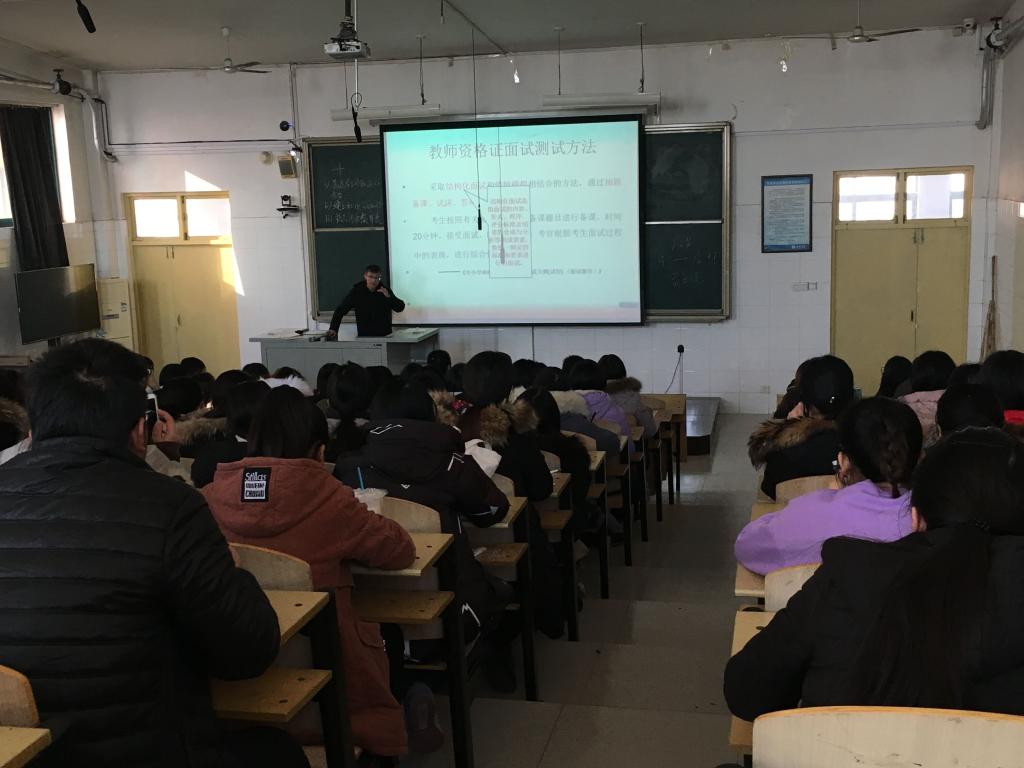 12月14日下午,我系实践教学教研室胡安波老师在文信楼第六阶梯教室为2016级全体学生做了《教师资格证面试流程与技巧》的专题辅导讲座。