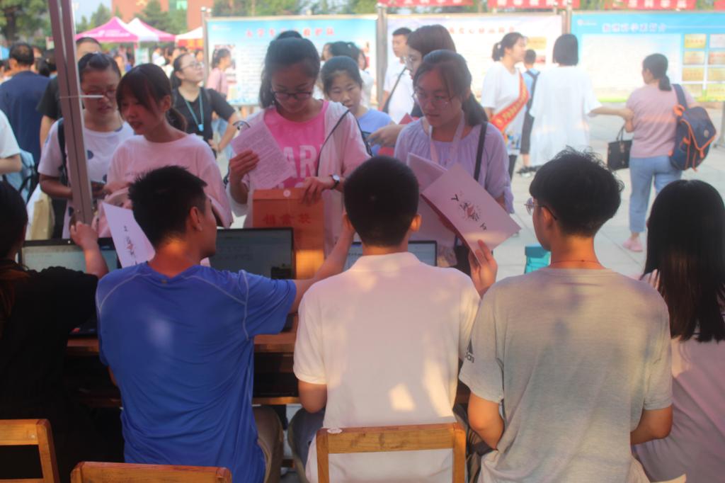 早上7:00,新生报到处的师生就已准备就绪,此时聚满了老师、家长和同学,各项新生报到工作有条不紊地进行。由大二学生组成的志愿者热情地接待新生,引导新生办理学籍注册、领取物品、入住学生公寓等入学手续。一趟又一趟地在接待处与学生公寓间来回奔走,虽然师生们很疲惫,但是看见家长与新生们通过自己的指引露出舒心的微笑时,师生们感到十分满足。对于部分家庭困难的学生,系领导一一与他们交流,迎新工作人员协助其及时办理“绿色通道”手续。宣传展板展示了系简介、社团活动、特色教育等内容,让每一名新生和家长能够全方位了解我系的发展和现状。