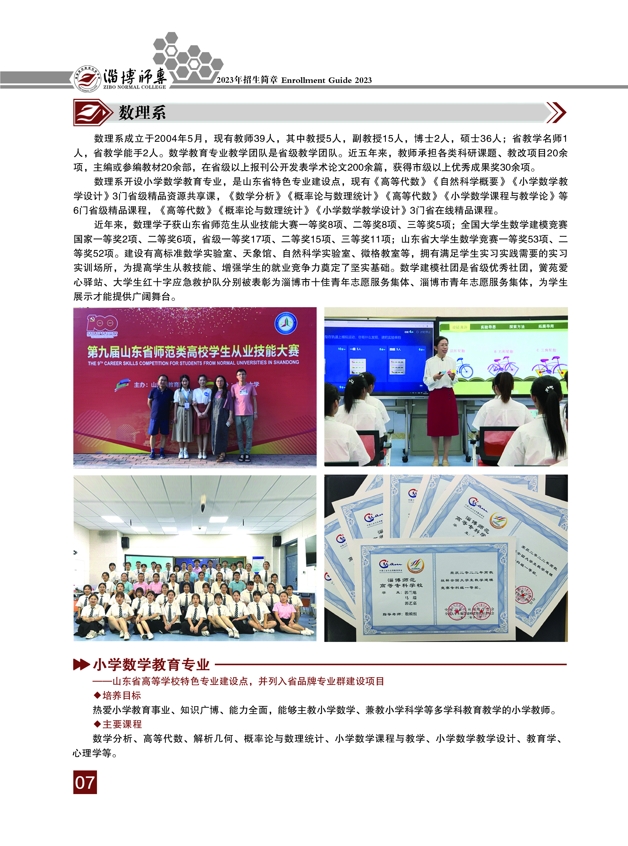 近年来,数理学子获山东省师范生从业技能大赛一等奖8项、二等奖8项、三等奖5项;全国大学生数学建模竞赛国家一等奖2项、二等奖6项,省级一等奖17项、二等奖15项、三等奖11项;山东省大学生数学竞赛一等奖53项、二等奖52项。建设有高标准数学实验室、天象馆、自然科学实验室、微格教室等,拥有满足学生实习实践需要的实习实训场所,为提高学生从教技能、增强学生的就业竞争力奠定了坚实基础。数学建模社团是省级优秀社团,黉苑爱心驿站、大学生红十字应急救护队分别被表彰为淄博市十佳青年志愿服务集体、淄博市青年志愿服务集体,为学生展示才能提供广阔舞台。