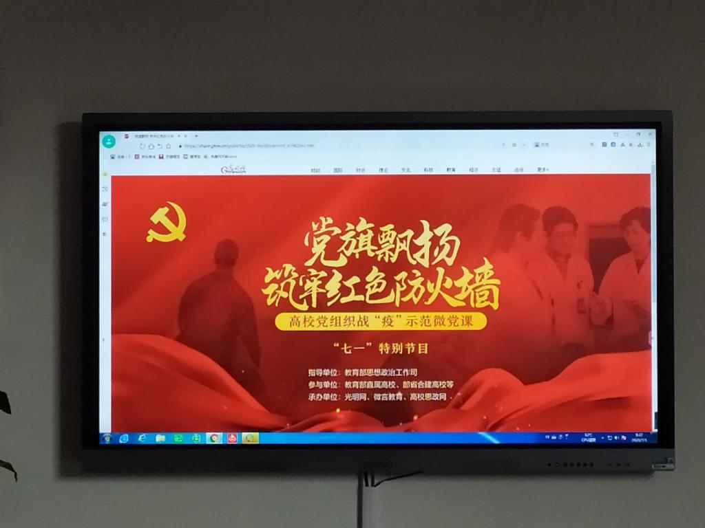 7月1日上午,系党支部组织全体党员在系党员活动室集体观看由教育部思想政治工作司指导的“党旗飘扬,筑牢红色防火墙”为主题的高校战“疫”示范微党课。